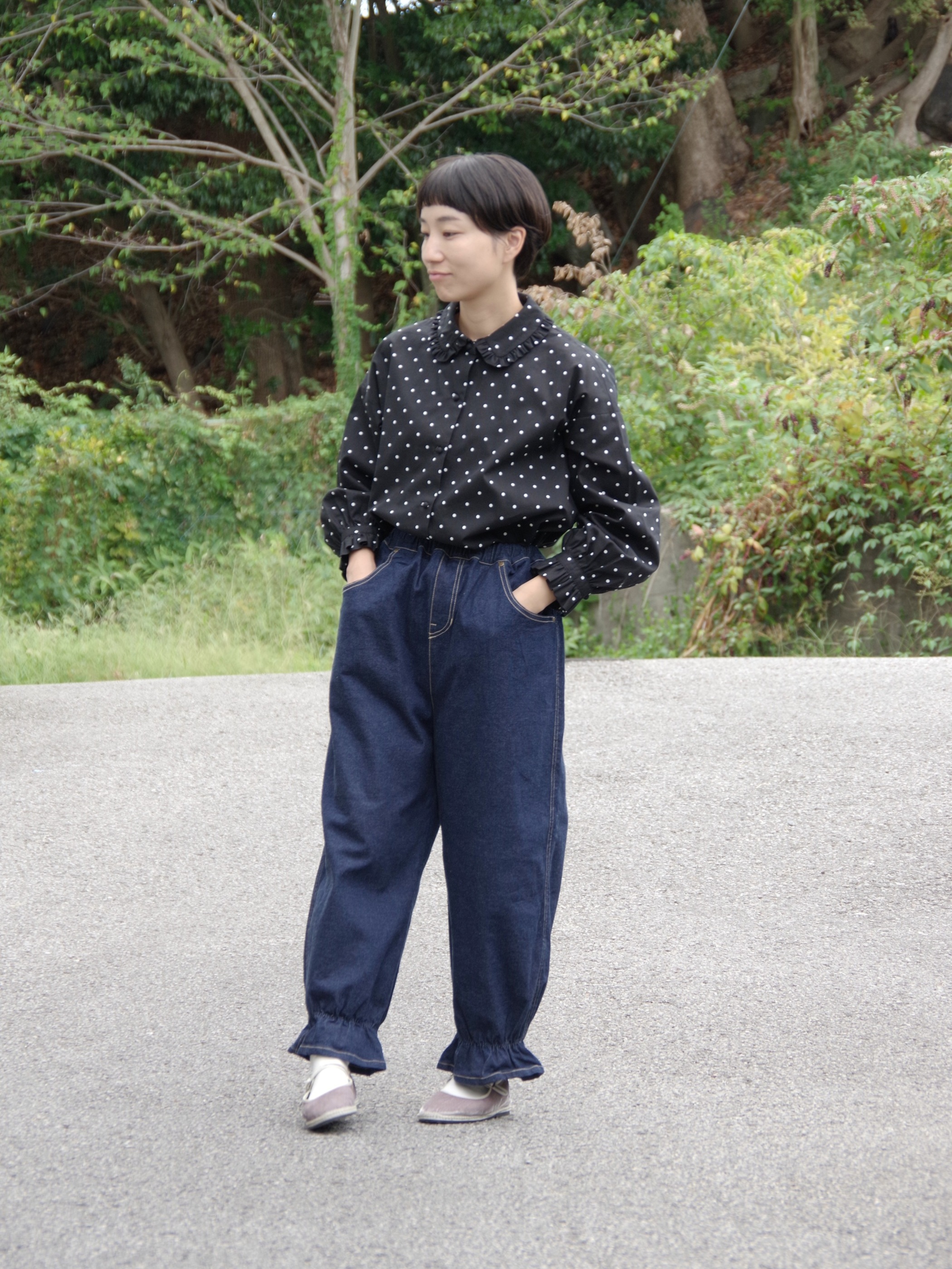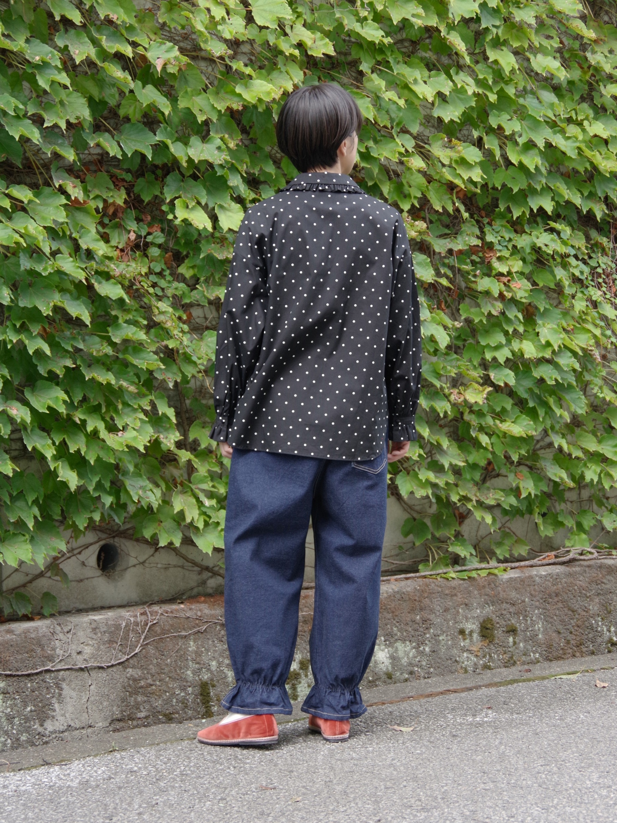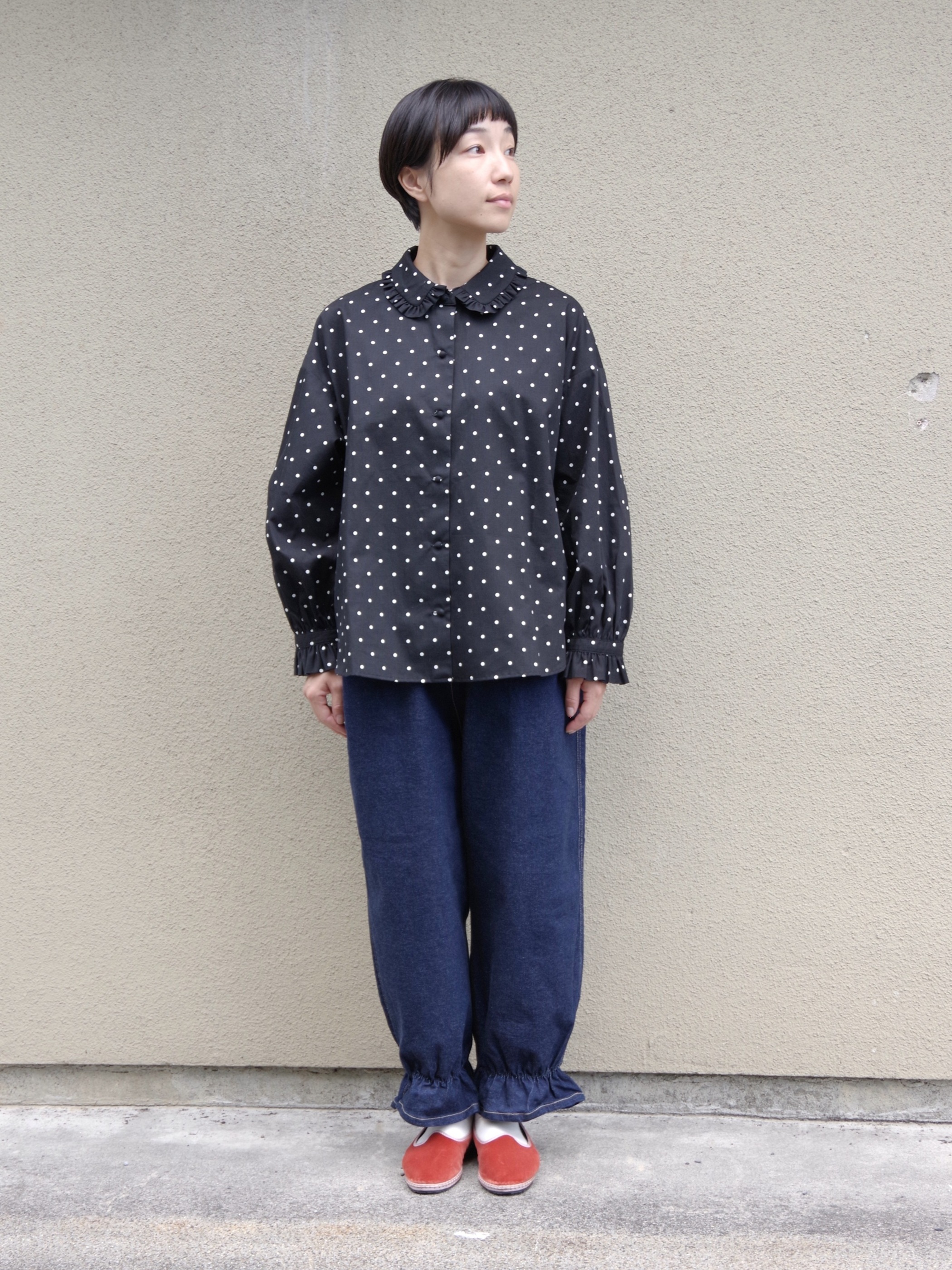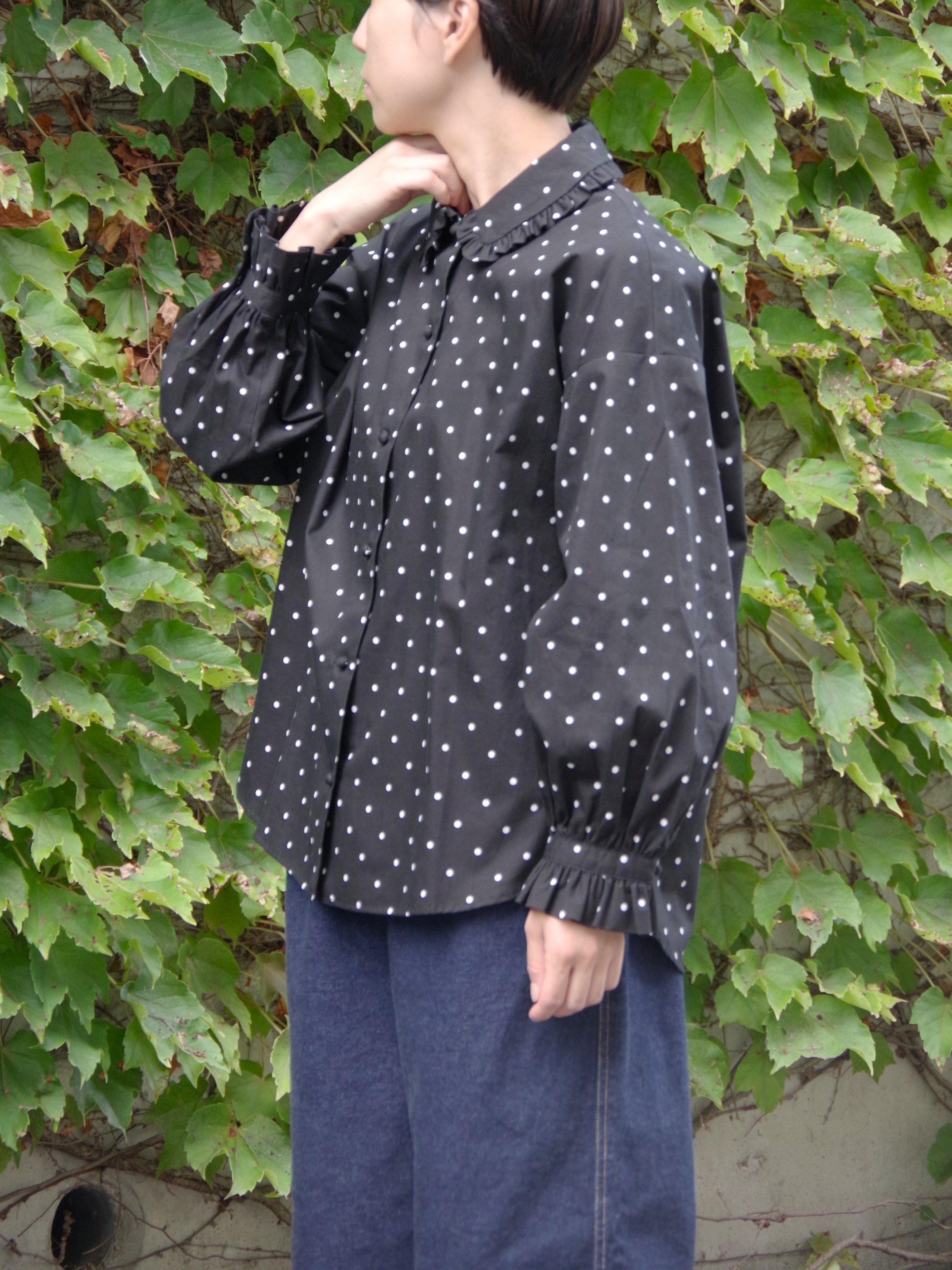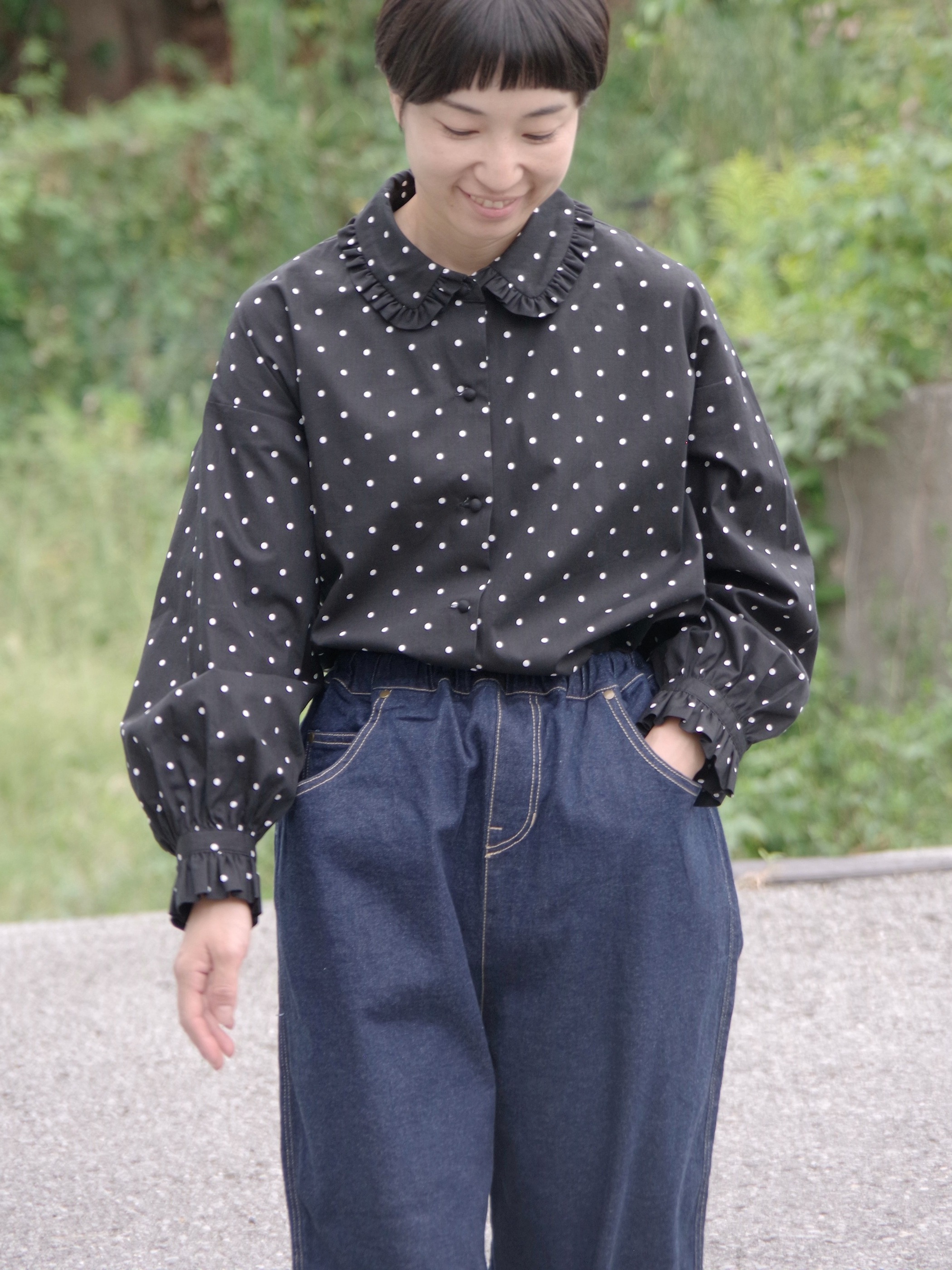 ドット柄とフリルが組み合わさった、着ているだけで元気になれる一着です。